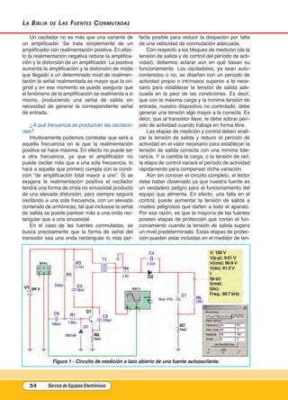 El documento describe los diferentes componentes y tipos de fuentes conmutadas. Explica que el oscilador de una fuente conmutada genera la señal alterna original que excita el transistor llave. También describe que las fuentes pueden tener el oscilador en un bloque separado o integrado en el transistor llave. Luego explica que las fuentes tienen etapas de medición de tensión, control del período de actividad y protección contra sobretensión. Finalmente, detalla cómo funciona una fuente conmutada autooscilante con realimentación positiva y cómo regula su
