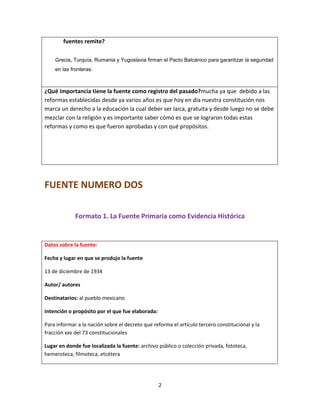 Este documento contiene 8 fuentes primarias relacionadas con la educación en México entre 1934 y 1937. A través de las fuentes se puede conocer sobre reformas educativas, conflictos entre maestros, protestas de padres de familia y la intención del gobierno de implementar una educación socialista. Las fuentes provienen de archivos públicos y colecciones privadas y proporcionan contexto histórico sobre la educación y la sociedad mexicana durante ese periodo.