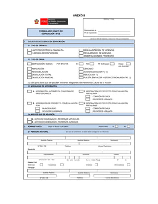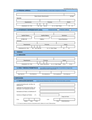 Este documento contiene un formulario para solicitar una licencia de edificación. Solicita información sobre el proyecto de construcción propuesto, incluida la ubicación del terreno, los planos arquitectónicos, los detalles de la estructura y las instalaciones, y los nombres de los profesionales involucrados en el diseño. También pide documentos que demuestren el derecho a edificar y el cumplimiento de los requisitos municipales.