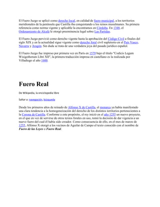 El documento describe el Fuero Juzgo, un cuerpo legal elaborado en 1241 por Fernando III que constituye la traducción al castellano del Liber Iudiciorum visigodo. Rigió en la península ibérica durante la dominación visigoda y estableció una norma de justicia común para visigodos e hispanorromanos. Está formado por 12 libros y un apéndice con vocabulario antiguo. Se aplicó como derecho local en territorios meridionales conquistados a los reinos musulmanes y pervivió hasta la a