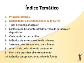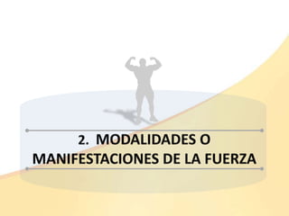 El documento describe los principios básicos de la fuerza muscular y sus diferentes modalidades o manifestaciones. Explica que la fuerza es necesaria para poner el cuerpo en movimiento y oponerse a resistencias. Luego define tipos de fuerza como general, específica, máxima, velocidad y resistencia. También clasifica las contracciones musculares en isométrica, anisométrica, concéntrica, excéntrica y pliométrica. Por último, proporciona referencias bibliográficas sobre el tema.