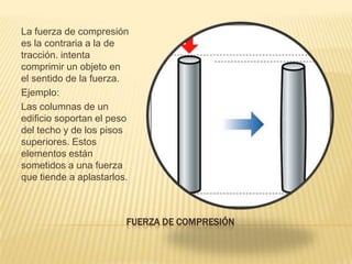 La fuerza de compresión intenta comprimir un objeto y actúa en sentido contrario a la fuerza de tracción. Por ejemplo, las columnas de un edificio soportan el peso del techo y los pisos superiores, y están sometidas a una fuerza de compresión que tiende a aplastarlas.