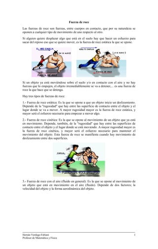 Este documento describe las diferentes fuerzas de roce, incluyendo la estática, cinética y con el aire. Explica que la rugosidad entre superficies determina la magnitud de la fuerza de roce. También aclara que la fuerza de roce estática que se opone al movimiento de un objeto es mayor que la fuerza cinética que se opone a mantener el movimiento.