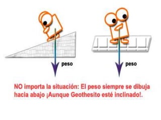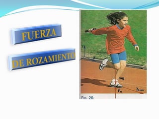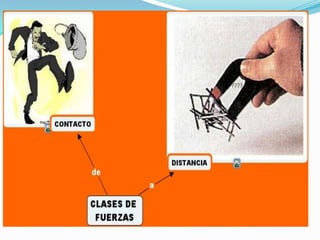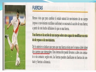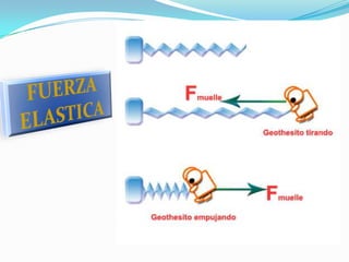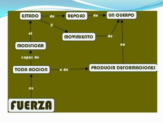 Este documento resume conceptos básicos de fuerza y movimiento. Explica que la fuerza se mide en newtons y da ejemplos como el peso, la fuerza normal y elástica. Distingue entre masa (cantidad de materia) y peso (fuerza de gravedad) y cómo se relacionan. También resume la ley de Hooke sobre elasticidad y las tres leyes de Newton sobre movimiento.
