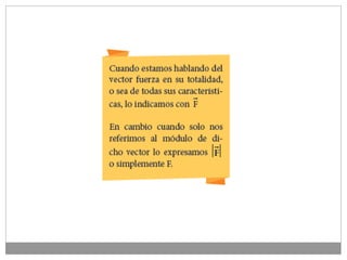 Este documento introduce el concepto científico de fuerza como una interacción entre dos o más cuerpos que puede producir cambios en la forma o velocidad de un cuerpo. Explica que la fuerza es una magnitud vectorial con dirección, sentido y módulo. También define la unidad de fuerza en el Sistema Internacional como el Newton.
