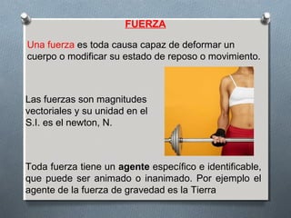 Este documento describe las fuerzas y sus características. Define una fuerza como cualquier causa capaz de deformar un cuerpo o modificar su estado de reposo o movimiento. Explica que las fuerzas tienen magnitud, dirección y sentido, y que existen fuerzas por contacto y fuerzas a distancia. Resume las tres leyes de Newton sobre el movimiento de los cuerpos y las consecuencias de estas leyes como la inercia y el peso.