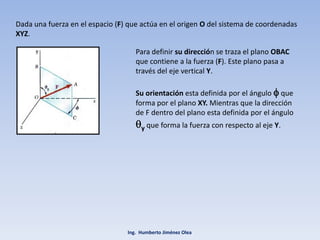 El documento describe los métodos para descomponer una fuerza en el espacio en componentes rectangulares y determinar su dirección. Se explica cómo descomponer una fuerza en tres componentes ortogonales Fx, Fy y Fz usando ángulos. También se presentan fórmulas para calcular la magnitud de una fuerza a partir de sus componentes y para sumar fuerzas en el espacio.
