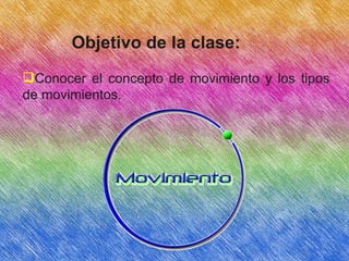 Este documento presenta conceptos clave sobre el movimiento, incluyendo los tipos de movimiento (rectilíneo, en curvas y de vibración), la diferencia entre trayectoria y desplazamiento, y la necesidad de un sistema de referencia para determinar el movimiento de un objeto. También introduce los conceptos de velocidad y rapidez.