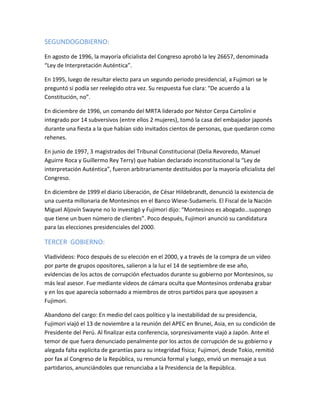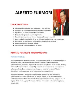 El documento describe el gobierno de Alberto Fujimori en Perú entre 1990 y 2000. Fujimori asumió un gobierno autoritario que aplicó políticas económicas neoliberales bajo la influencia de Estados Unidos y el FMI, privatizando empresas y servicios públicos. Su primer gobierno disolvió el Congreso y derrotó a grupos terroristas, pero también fue acusado de violaciones a los derechos humanos. En los años siguientes, Fujimori buscó perpetuarse en el poder mediante medios corruptos y antidemocrá