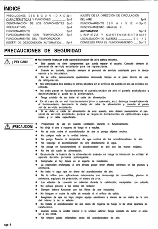 Este documento proporciona instrucciones para el funcionamiento y mantenimiento de un acondicionador de aire. Explica las características y funciones del aparato como el funcionamiento automático, temporizador de desconexión automática, y telemando inalámbrico. También describe los componentes del acondicionador de aire y proporciona instrucciones detalladas sobre la preparación, funcionamiento, ajuste de la temperatura y modo de operación.