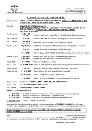 El documento es una comunicación del mes de abril de un colegio. Anuncia las fechas de vacaciones de Semana Santa, las actividades planeadas para los diferentes cursos incluyendo salidas educativas y viajes, y el horario intensivo del centro en junio. También informa sobre talleres y obras de teatro.