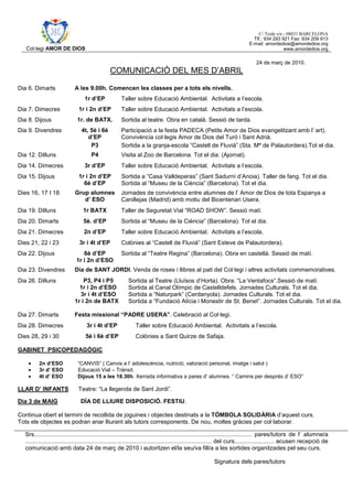 Este documento contiene el calendario de actividades del colegio Amor de Dios para el mes de abril. Incluye talleres educativos, salidas culturales, obras de teatro y colonias para diferentes cursos. También comunica las charlas del gabinete psicopedagógico y la recaudación de fondos para una rifa solidaria. Solicita la autorización de los padres para las salidas de los alumnos.