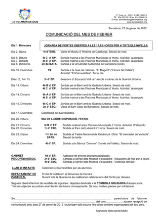 La comunicación detalla las actividades y salidas escolares planeadas para el mes de febrero en el Colegio AMOR DE DIOS en Barcelona, incluyendo visitas educativas, celebraciones como el Carnaval y el Miércoles de Ceniza, y charlas de la Guardia Urbana y los Mossos d'Esquadra. También solicita la autorización de los padres para las salidas de los estudiantes.