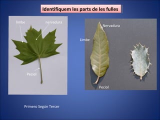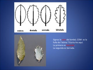El documento describe las características de las hojas de encina y roble. Identifica que la hoja de encina es dentada, lanceolada y pinnatinérvia según la forma del borde, la forma general y la venación. También describe una hoja marron, serrada y palmatinérvia que corresponde al roble.