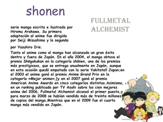 Fullmetal Alchemist es un manga y anime sobre los hermanos Edward y Alphonse Elric, quienes buscan la Piedra Filosofal para recuperar sus cuerpos después de un fallido intento de revivir a su madre usando alquimia. Edward perdió un brazo y una pierna, mientras que Alphonse perdió su cuerpo físico y su alma está alojada en una armadura. A lo largo de sus aventuras, conocen nuevos personajes y enfrentan desafíos en su búsqueda.