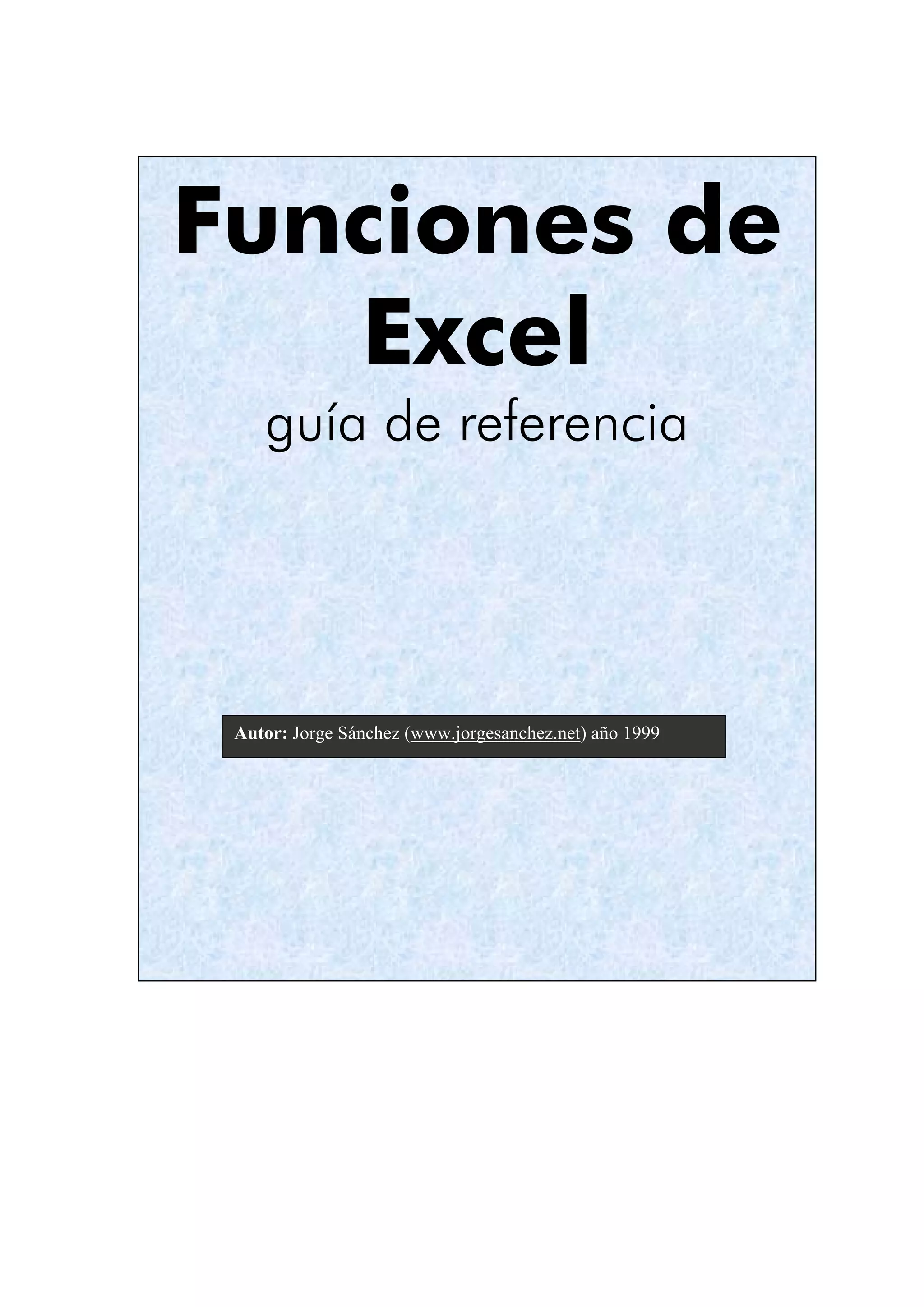 Este documento proporciona una guía de referencia de las funciones de Excel. Incluye secciones sobre operaciones matemáticas simples y complejas, funciones para usar con fechas, textos, lógica, búsqueda, estadística, finanzas e información. Explica funciones como SUM, MAX, MIN, PROMEDIO, AHORA, TEXTO, BUSCAR, DESVEST, AMORTIZACIÓN y más, con ejemplos de su uso. El autor es Jorge Sánchez y la guía fue publicada en 1999.