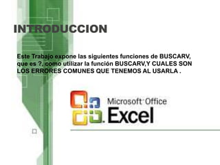 Este documento explica la función BUSCARV en Excel, la cual permite buscar un valor dentro de un rango de datos organizados verticalmente. Describe cómo preparar los datos, los argumentos requeridos de la función (valor buscado, rango de búsqueda, columna de resultado), y cómo realizar una búsqueda paso a paso. También cubre errores comunes como especificar un número de columna inválido o buscar un valor que no existe.