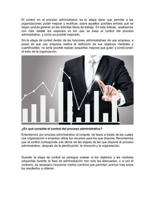El documento explica la importancia del control en el proceso administrativo de una organización. El control permite evaluar y corregir errores para mejorar los resultados. Consiste en establecer criterios de evaluación, medir el desempeño, y comparar los valores reales con los objetivos. Incluye controles previos, de vigilancia y sobre resultados. El control es fundamental para conocer el grado de satisfacción del proceso y encontrar oportunidades de mejora.