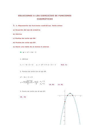 Este documento presenta ejercicios resueltos sobre funciones cuadráticas. En la primera sección, se representan gráficamente tres funciones cuadráticas y se calculan sus vértices, puntos de corte con los ejes y otros valores. La segunda sección encuentra el vértice y eje de simetría de dos parábolas. La tercera sección indica cuántos puntos de corte tienen cuatro parábolas con el eje de abscisas. La cuarta sección calcula el valor de 'a' para una función cuadrática dada que