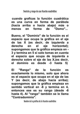 Una función cuadrática es una función polinómica de segundo grado definida como y = ax2 + bx + c, donde a ≠ 0. Las gráficas de estas funciones son parábolas verticales cuya forma depende de los signos de a y c, y cuyo vértice se encuentra en el punto (0,0) para funciones de la forma f(x) = x2. El dominio de una función cuadrática es el rango de valores en el eje x y su rango son los valores en el eje y.