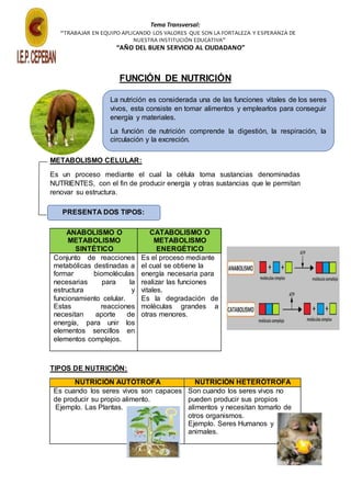 El documento describe los procesos de metabolismo celular, nutrición y fotosíntesis. Explica que el metabolismo consta de dos procesos: el anabolismo, que forma biomoléculas mediante la unión de elementos, y el catabolismo, que obtiene energía a través de la degradación de moléculas. Además, detalla los tipos de nutrición autótrofa y heterótrofa y las fases y componentes de la fotosíntesis como la tilacoide y el estroma. Finalmente, proporciona preguntas para