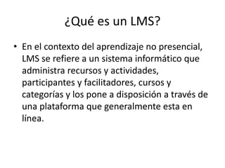 Un LMS (Sistema de Gestión del Aprendizaje) es un sistema informático que administra recursos educativos, actividades, participantes, cursos y categorías, poniéndolos a disposición a través de una plataforma en línea para facilitar el aprendizaje no presencial.