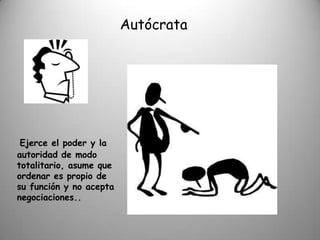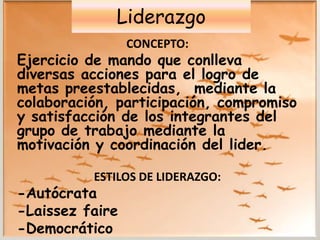 Este documento describe los conceptos de liderazgo y estilos de liderazgo, incluyendo autócrata, laissez-faire y democrático. También discute los rasgos de un líder efectivo como la motivación del equipo y el establecimiento de metas. Por último, cubre temas como la inteligencia emocional, la identificación y resolución de conflictos.