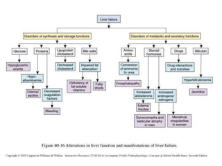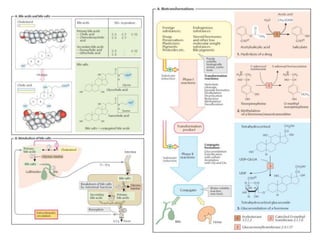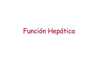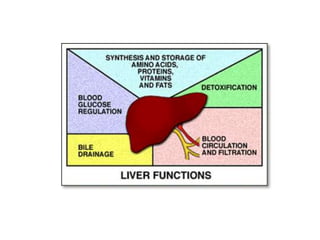 El documento describe las principales funciones del hígado, incluyendo el metabolismo de hidratos de carbono, lípidos, nitrógeno y otras funciones como la secreción biliar, metabolismo de la bilirrubina y detoxificación. El hígado juega un papel clave en la homeostasis de la glucosa, la síntesis y almacenamiento de glicógeno, la gluconeogénesis, el metabolismo de ácidos grasos y lípidos, la síntesis de proteínas y la producción de urea.