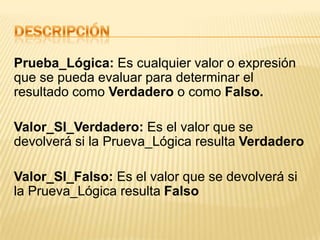 La función SI decide el contenido de una celda dependiendo de si una prueba lógica es verdadera o falsa. Usa la sintaxis =SI(prueba_lógica; valor_si_verdadero; valor_si_falso) donde la prueba lógica evalúa si es verdadero o falso y devuelve un valor u otro. Los operadores de comparación como <, >, = se usan comúnmente en la prueba lógica. La función SI es útil para problemas económicos y sociales al permitir condiciones con