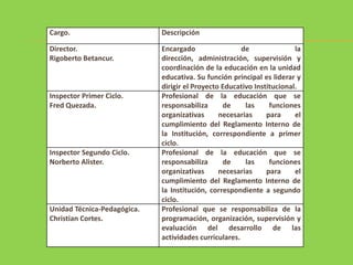 Este documento presenta la planta docente y asistente de una institución educativa, incluyendo cargos como Director, Inspectores, Unidad Técnico-Pedagógica, Profesores Jefes, Profesores de Asignatura, Docentes de Integración, SEP y Biblioteca. Describe brevemente las funciones de cada cargo y su objetivo de apoyar el cumplimiento del Proyecto Educativo Institucional.