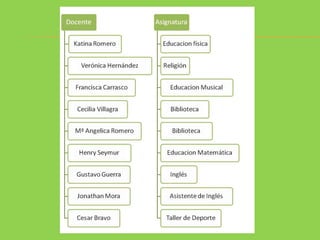 Este documento presenta la planta docente y asistente de una institución educativa para el año 2012. Detalla los cargos y funciones del director, inspectores, unidad técnico-pedagógica, profesores jefes de pre-básica, primer ciclo y segundo ciclo, profesores de asignatura, integración, SEP, biblioteca y asistentes de educación.