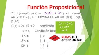 Una función proposicional es una función cuyas variables son proposiciones, es decir, afirmaciones que podrían asumir valores de verdad de falso o verdadero, excepto que existe alguna variable que no está definida y no permite asignar un valor de verdad. Un ejemplo es una función de la forma P(x) o P(x,y) donde al sustituir elementos del dominio se obtienen proposiciones cuya verdad puede evaluarse.