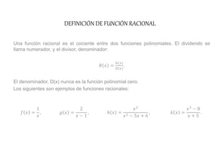Este documento presenta un plan de clase para enseñar funciones racionales en segundo año de bachillerato. El objetivo es determinar las características de una función racional y entender su comportamiento asintótico. El plan incluye definiciones, ejemplos y actividades para explicar el dominio, ceros, asíntotas y gráfica de funciones racionales.