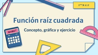 La función raíz cuadrada tiene como dominio los números reales no negativos y como recorrido los números reales no negativos. La función es creciente en todo su dominio y su valor mínimo es 0. El punto de corte con el eje x es (0,0). La función raíz cuadrada se representa gráficamente mediante una media parábola.