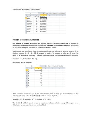 Este documento describe la función SI condicional en Excel, la cual devuelve un valor u otro dependiendo de si una condición es verdadera o falsa. Explica la sintaxis de la función SI, incluyendo sus tres argumentos obligatorios y opcionales. También proporciona un ejemplo de cómo usar la función SI para mostrar un mensaje de "APROBADO" o "REPROBADO" basado en la calificación de un alumno. Además, describe cómo anidar funciones SI para expandir la flexibilidad y permitir múltiples condiciones.