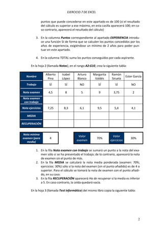 Este documento proporciona instrucciones para completar varios ejercicios en Excel. En el primer ejercicio, se pide crear una tabla con datos de candidatos a un concurso y usar funciones SI para calcular automáticamente los puntos de cada candidato en diferentes categorías. En el segundo ejercicio, se pide crear otra tabla y usar funciones SI para calcular notas de estudiantes. En el tercer ejercicio, se pide copiar una tabla de preguntas de un test y usar funciones SI para calcular automáticamente las puntuaciones. Finalmente, en el cu