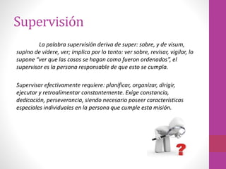 La supervisión implica vigilar y revisar el trabajo de los empleados para asegurar que se realice como fue planeado. Un supervisor efectivo planifica, organiza, dirige, ejecuta y retroalimenta constantemente el trabajo. Los objetivos de la supervisión incluyen mejorar la productividad, desarrollar el uso óptimo de recursos, obtener rentabilidad y desarrollar a los empleados. Las funciones clave de un supervisor son proyectar el trabajo, dirigir a los empleados, desarrollarlos y controlar el progreso.