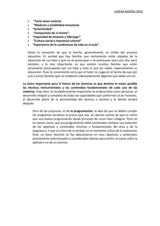 El documento describe la función tutorial del profesorado. Explica que la tutoría implica orientar a los estudiantes y asegurar su desarrollo académico y profesional mediante el fomento de estrategias de aprendizaje autónomo. También requiere cualidades como buen carácter, madurez emocional, empatía y liderazgo. Además, reconoce que aunque algunas familias no colaboran, otras sí apoyan la educación de sus hijos.