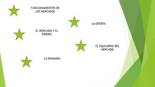 El documento explica los conceptos básicos de cómo funciona el mercado. Define que el mercado está compuesto por la oferta y la demanda de un bien. La demanda la determinan los compradores y la oferta los vendedores. Explica que el equilibrio de mercado se da cuando la oferta y la demanda se igualan en un punto, evitando así los excesos de oferta o demanda.
