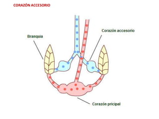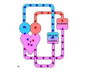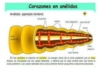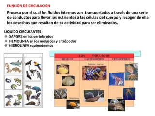 El documento describe la función de circulación y los sistemas de circulación en diferentes organismos. La circulación involucra el transporte de fluidos como la sangre o hemolinfa a través de conductos para llevar nutrientes a las células y recoger desechos. Los organismos tienen diferentes tipos de corazones, como corazones tubulares en artrópodos o corazones tabicados en vertebrados, y sistemas de circulación abierta u cerrada.