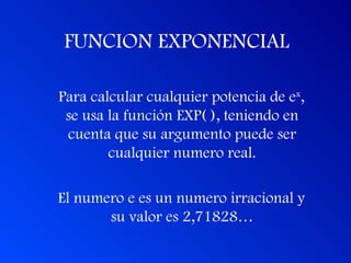 Este documento explica cómo usar las funciones exponencial y logarítmica en Excel. La función EXP(x) calcula e^x, mientras que la función LN(x) calcula el logaritmo natural de x. Se proveen ejemplos numéricos para ilustrar cómo estas funciones pueden usarse para calcular potencias de e y logaritmos.