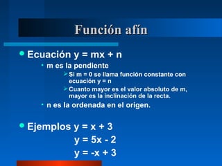 El documento explica las funciones afines y lineales, incluyendo sus ecuaciones y representaciones gráficas. Define la pendiente y la ordenada en el origen de una función afín, y cómo estas características determinan si la recta es creciente o decreciente. También cubre las diferentes formas de escribir la ecuación de una recta y ejemplos de cómo convertir entre ellas.
