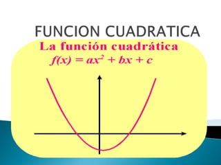 Una función cuadrática es una función polinómica de grado dos definida por una ecuación de la forma f(x)=ax^2 + bx + c, donde a, b y c son constantes y a no es cero. La gráfica de una función cuadrática es una parábola, la cual puede estar orientada hacia arriba o hacia abajo dependiendo del signo de a. Las funciones cuadráticas describen relaciones no lineales entre variables donde la variable dependiente crece o decrece a una tasa cambiante con respecto a la variable independiente.