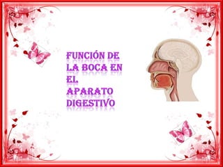 La boca desempeña un papel importante en la digestión al permitirnos saborear los alimentos, masticarlos con los dientes para ablandarlos y mezclarlos con saliva, que contiene enzimas digestivas. La lengua y los labios ayudan a sostener la comida durante la masticación, mientras que las glándulas salivales como la parótida, submandibular y sublingual producen saliva para iniciar la digestión química de los alimentos en la boca.