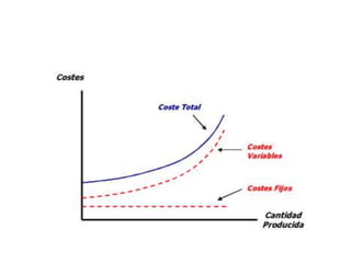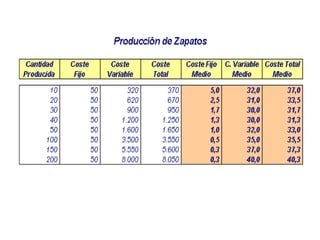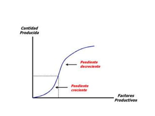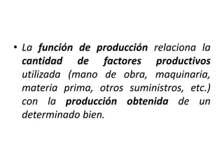 La función de producción relaciona los factores productivos utilizados con la producción obtenida. Inicialmente, la producción aumenta más que proporcionalmente al aumentar los factores, pero luego disminuye la eficiencia debido a leyes como la del producto marginal decreciente. Las curvas de costes muestran cómo varían los costes totales, medios y marginales con diferentes niveles de producción a corto y largo plazo.