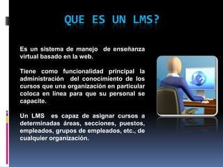Un LMS es un sistema de gestión del aprendizaje basado en la web que permite a las organizaciones administrar el conocimiento de los cursos que ofrecen en línea a su personal. Un LMS puede asignar cursos a áreas, secciones, puestos y empleados específicos. Su objetivo principal es mejorar el conocimiento de los empleados y aumentar la eficiencia a través del aprendizaje en línea.