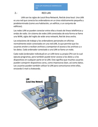 Una red informática conecta equipos informáticos para compartir información y recursos. Existen varios tipos de redes como LAN (red de área local), MAN (red de área metropolitana) y WAN (red de área amplia), las cuales se diferencian por el tamaño del área que cubren. Dentro de una red, los equipos pueden estar conectados siguiendo diferentes topologías como bus, estrella, anillo, árbol o malla.