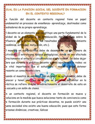 El documento describe el papel fundamental del docente en el contexto regional y en los procesos de enseñanza-aprendizaje. El docente es un elemento clave en la calidad de la educación y tiene una gran influencia en los resultados educativos de los estudiantes. Durante la práctica docente, el maestro debe utilizar una variedad de actividades lúdicas y pedagógicas que se vean afectadas por el entorno. La práctica docente requiere que los maestros interactúen y comuniquen conocimientos de manera significativa a