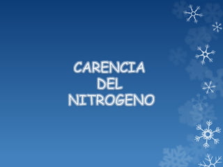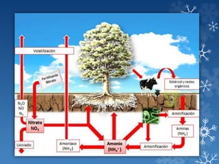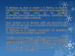 El nitrógeno es un nutriente esencial para las plantas que forma parte de compuestos como proteínas, clorofila y ácidos nucleicos. Se absorbe principalmente en forma de nitrato y amonio a través de las raíces. La disponibilidad de nitrógeno en el suelo depende de procesos como la mineralización, nitrificación y fijación biológica. La deficiencia o exceso de nitrógeno afecta negativamente el crecimiento y desarrollo de las plantas.
