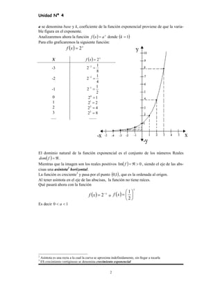 El documento explica el concepto de función exponencial y cómo se produce una reacción en cadena en un reactor nuclear. Se define una función exponencial como aquella cuya variable aparece en el exponente y se analizan las características de funciones de la forma f(x)=ax. Las funciones exponenciales son crecientes, su dominio son los números reales y su imagen los positivos, y no cortan el eje x.